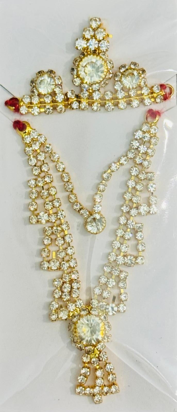 Add a touch of brilliance to your Laddu Gopal’s appearance with this dazzling combo set. The sparkling diamond-styled mukut and intricately layered mala are crafted with shimmering crystal stones set in golden base, offering a majestic and divine finish.