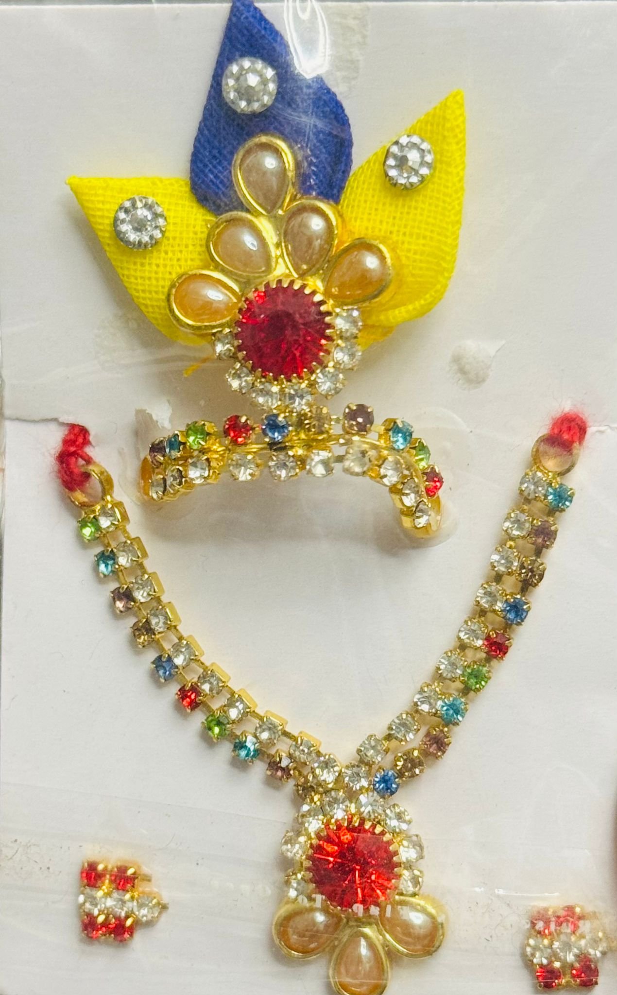 Add festive charm to your deity’s attire with this vibrant Laddu Gopal accessory set. Featuring a striking red floral centerpiece and a dazzling combination of multicolor stones, the crown is adorned with yellow and blue feathers, making it perfect for Janmashtami and daily use.