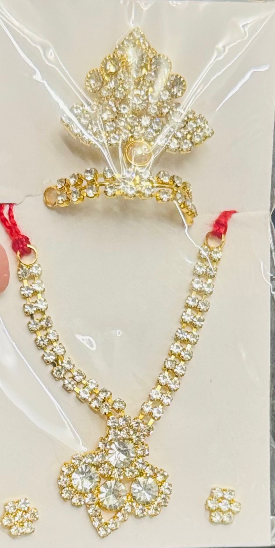 Elevate your Laddu Gopal’s appearance with this premium diamond-look mala and mukut combo. The dazzling clear stones shimmer beautifully on a gold-toned base, adding divine charm and elegance. Perfect for special occasions and daily adornment.