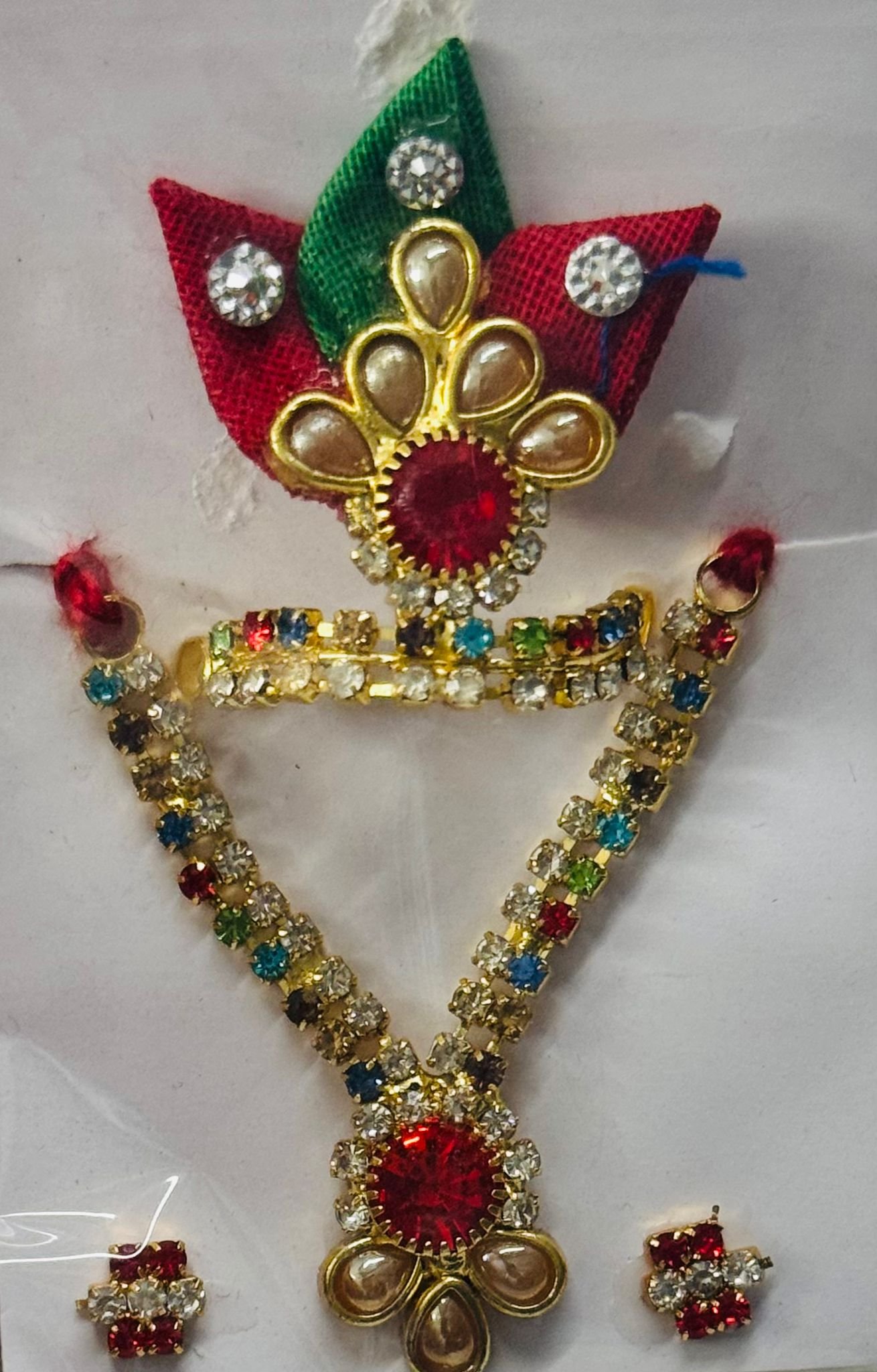 Brighten your Laddu Gopal’s look with this stunning multicolor mala and red mukut combo. Designed with vibrant stones in blue, green, red, and white, this set adds a joyful, festive flair. The red fabric crown with a green accent is detailed with pearls and rhinestones for a divine finish.