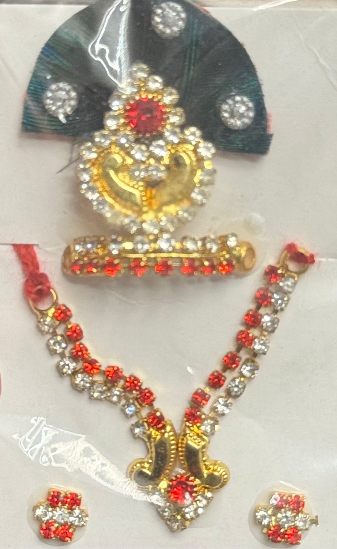Laddu Gopal Accessory Set – Mala & Mukut Combo | Peacock Feather Crown with Red-Gold Pendant