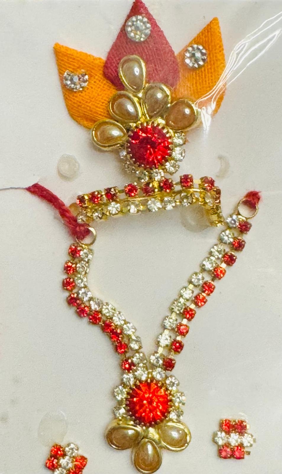 Laddu Gopal Accessory Set – Mala & Mukut Combo | Red Stones with Floral Motif
