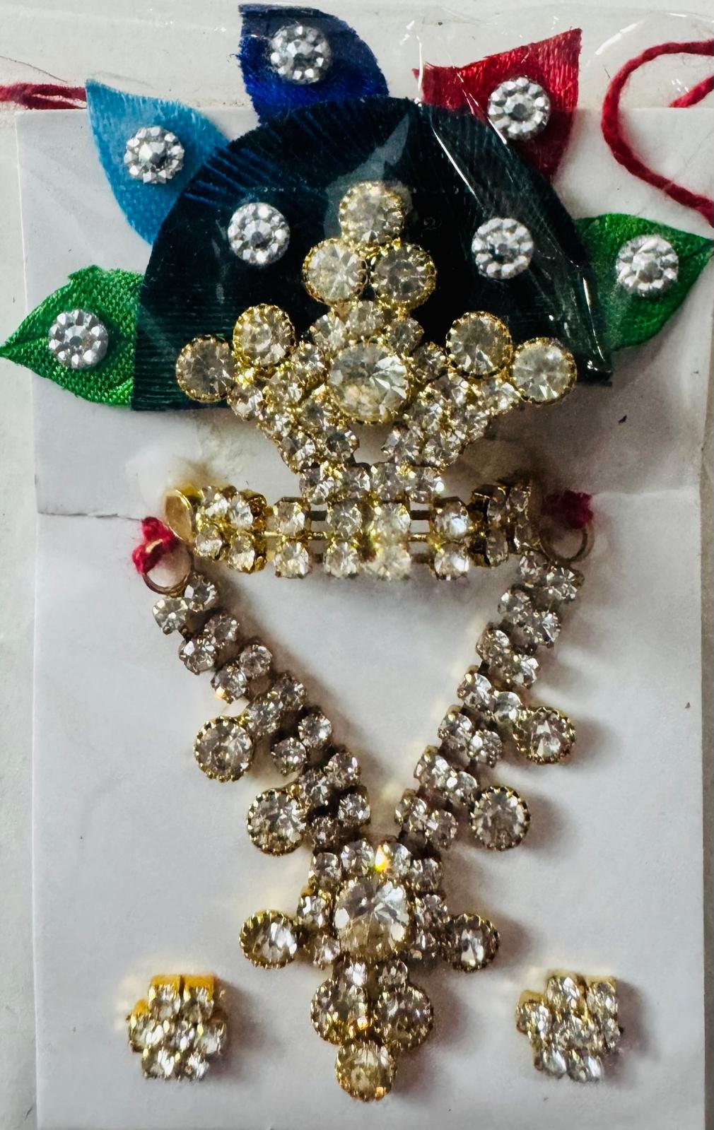 This elegant Laddu Gopal accessory combo features a sparkling white stone mukut with a multicolor satin backdrop and a matching mala. The intricate craftsmanship radiates purity and divine charm, complete with delicate matching earrings – ideal for festive and daily adornment.