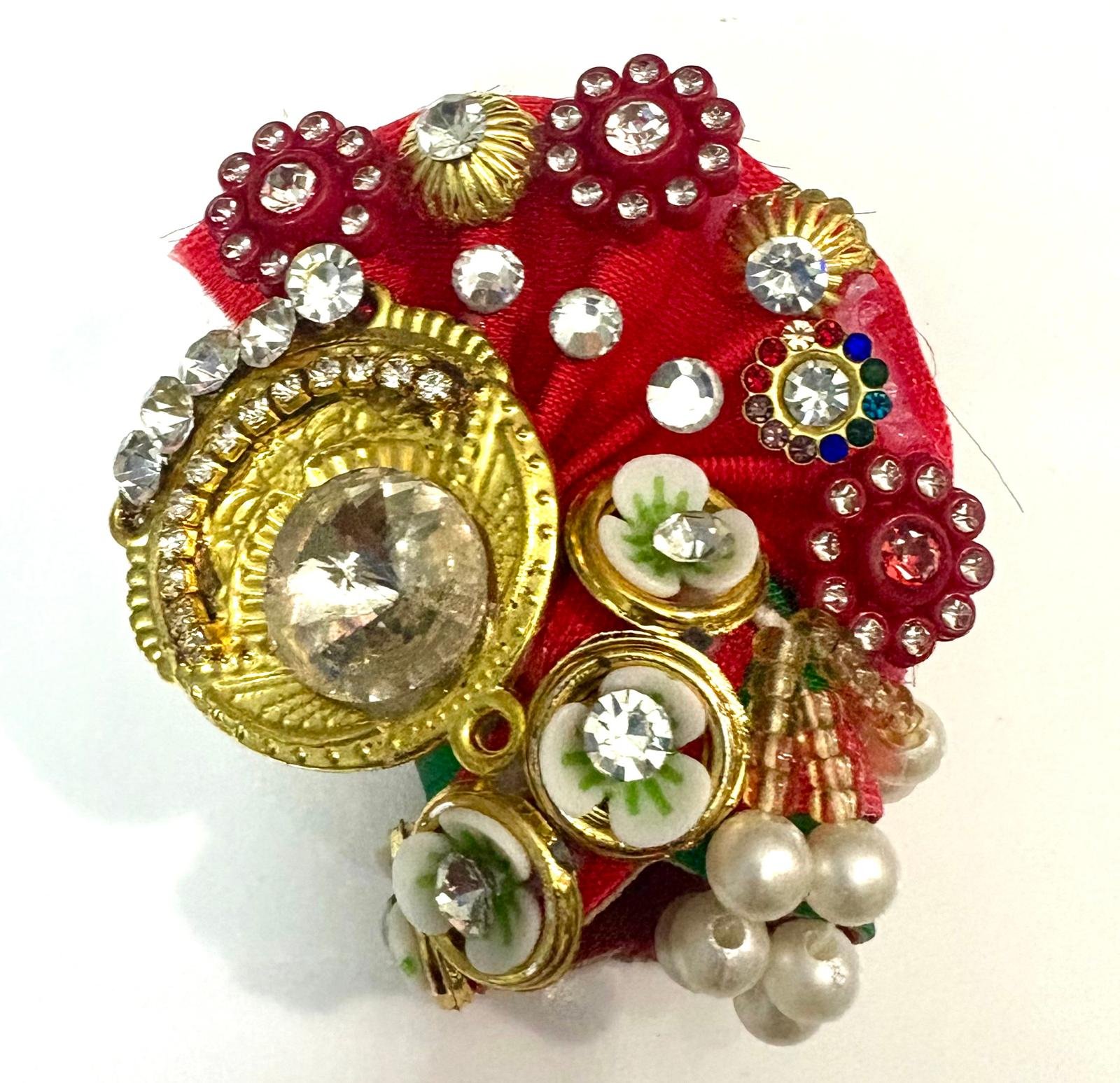 Exquisitely crafted Size 2 Laddu Gopal mukut with shimmering stonework, floral accents, and pearl details. A vibrant addition for your deity’s royal adornment.