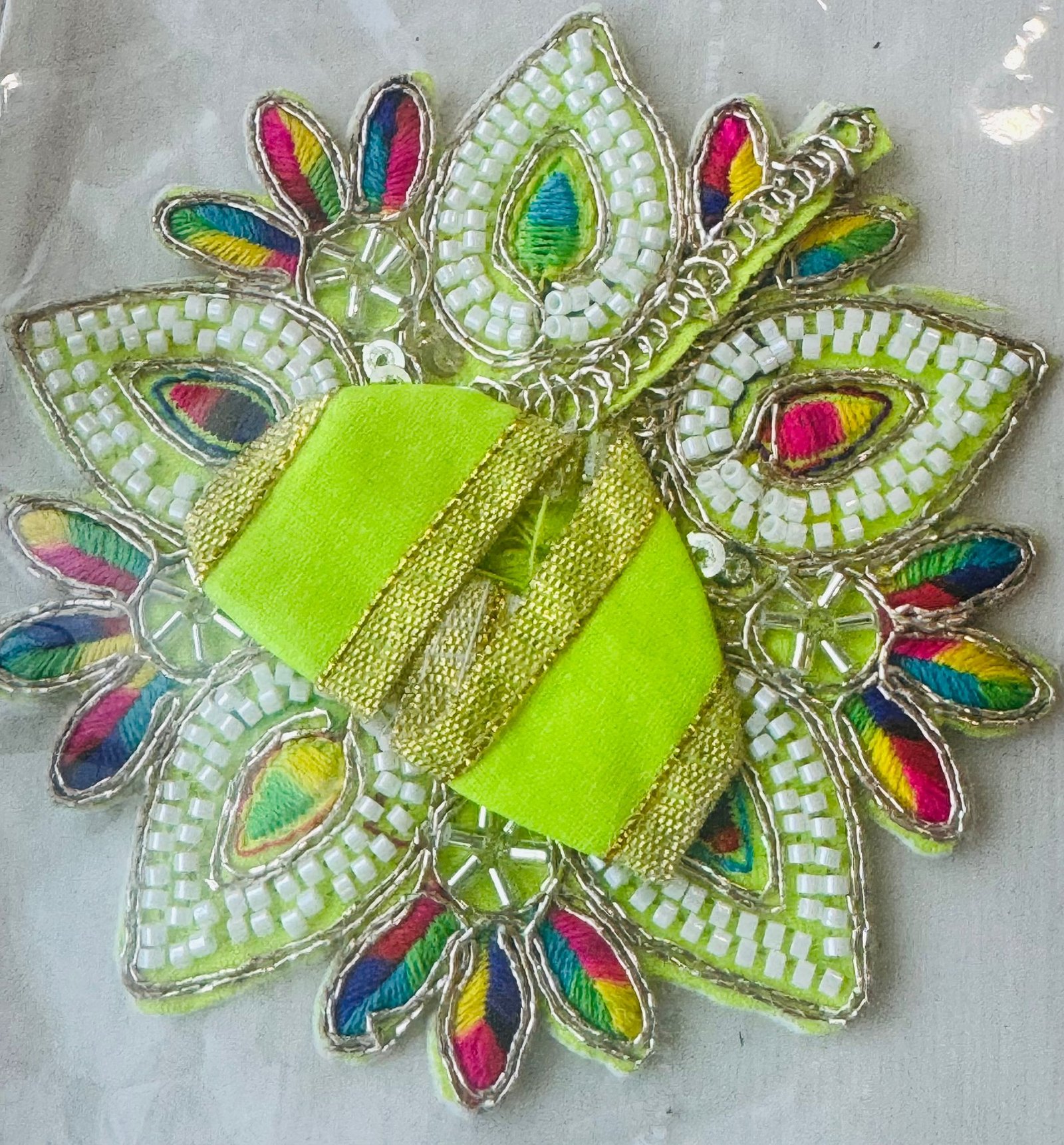 Size 0 Laddu Gopal dress in vibrant parrot green, highlighted with intricate white bead work and multicolor thread embroidery in peacock-feather-inspired motifs. A lively and festive outfit for your beloved deity.