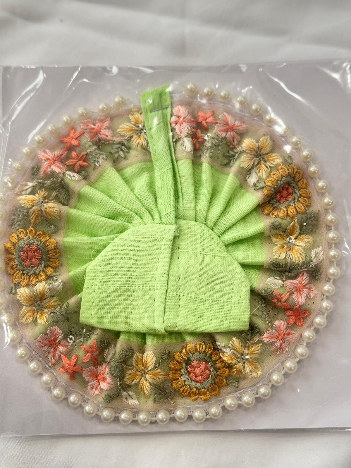 Dress your Laddu Gopal in this charming Size 2 light green outfit, exuding freshness and serenity. The dress is beautifully adorned with intricate pastel-colored thread embroidery featuring floral patterns in pink, yellow, and white, giving it a soft, elegant look. The pearl border adds a touch of classic grace, making it ideal for daily puja, spring festivals, or thoughtful gifting.