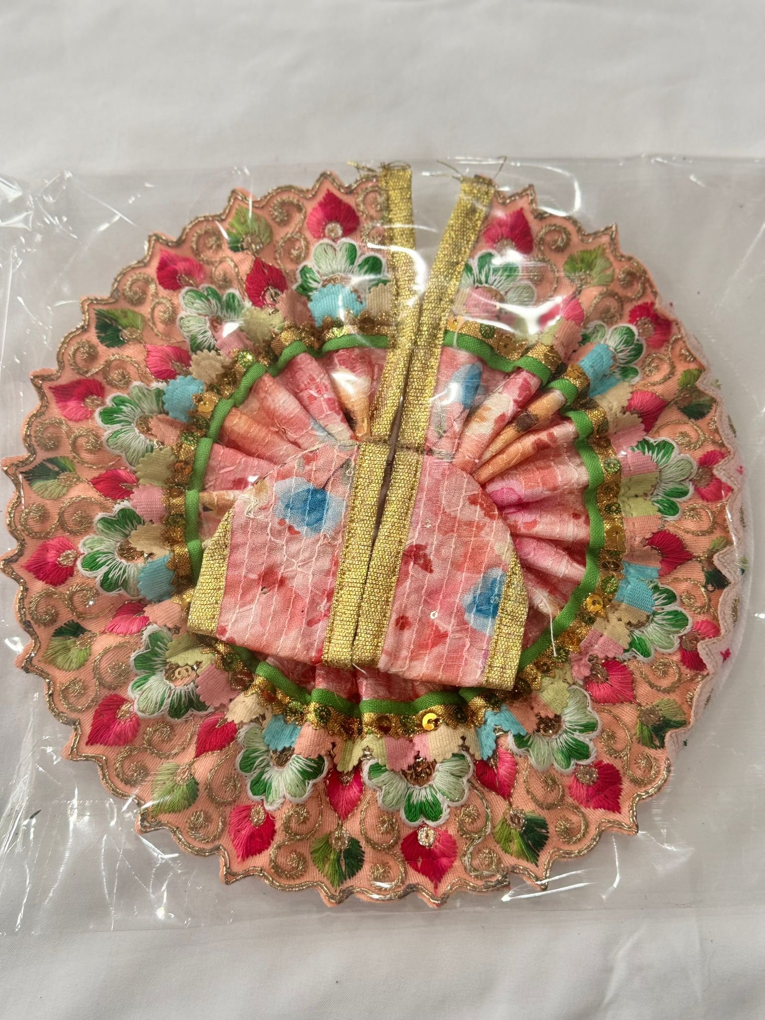 Charming Size 3 Laddu Gopal dress in a soft peach base, adorned with vibrant floral embroidery in pink, green, blue, and gold. The pleated circular design is finished with shimmering sequins, green lace, and golden zari trim, perfect for festive and everyday devotion.
