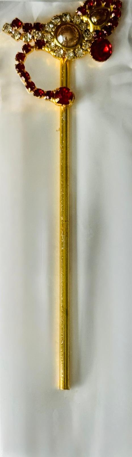 Make your Laddu Gopal’s appearance divine with this unique 4.25-inch golden flute, featuring a majestic peacock eye design encrusted with sparkling white stones. Accented with vibrant beads in pink, blue, and yellow, this piece exudes playful elegance.