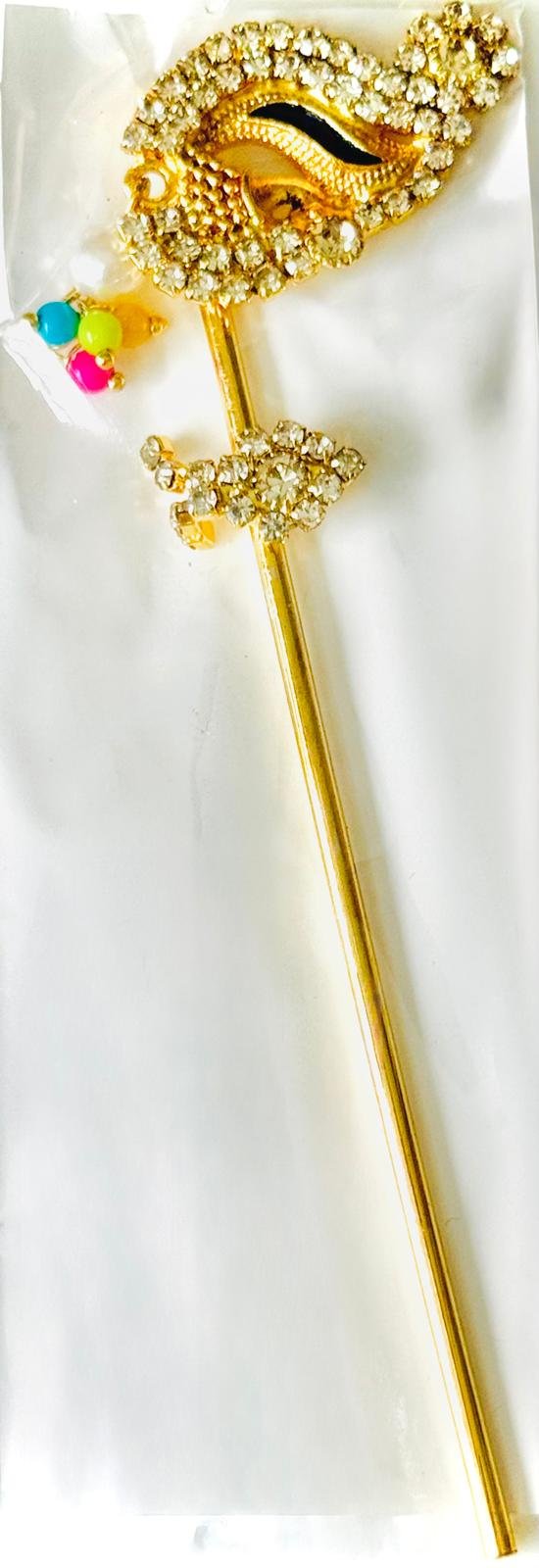Make your Laddu Gopal’s appearance divine with this unique 4.25-inch golden flute, featuring a majestic peacock eye design encrusted with sparkling white stones. Accented with vibrant beads in pink, blue, and yellow, this piece exudes playful elegance.