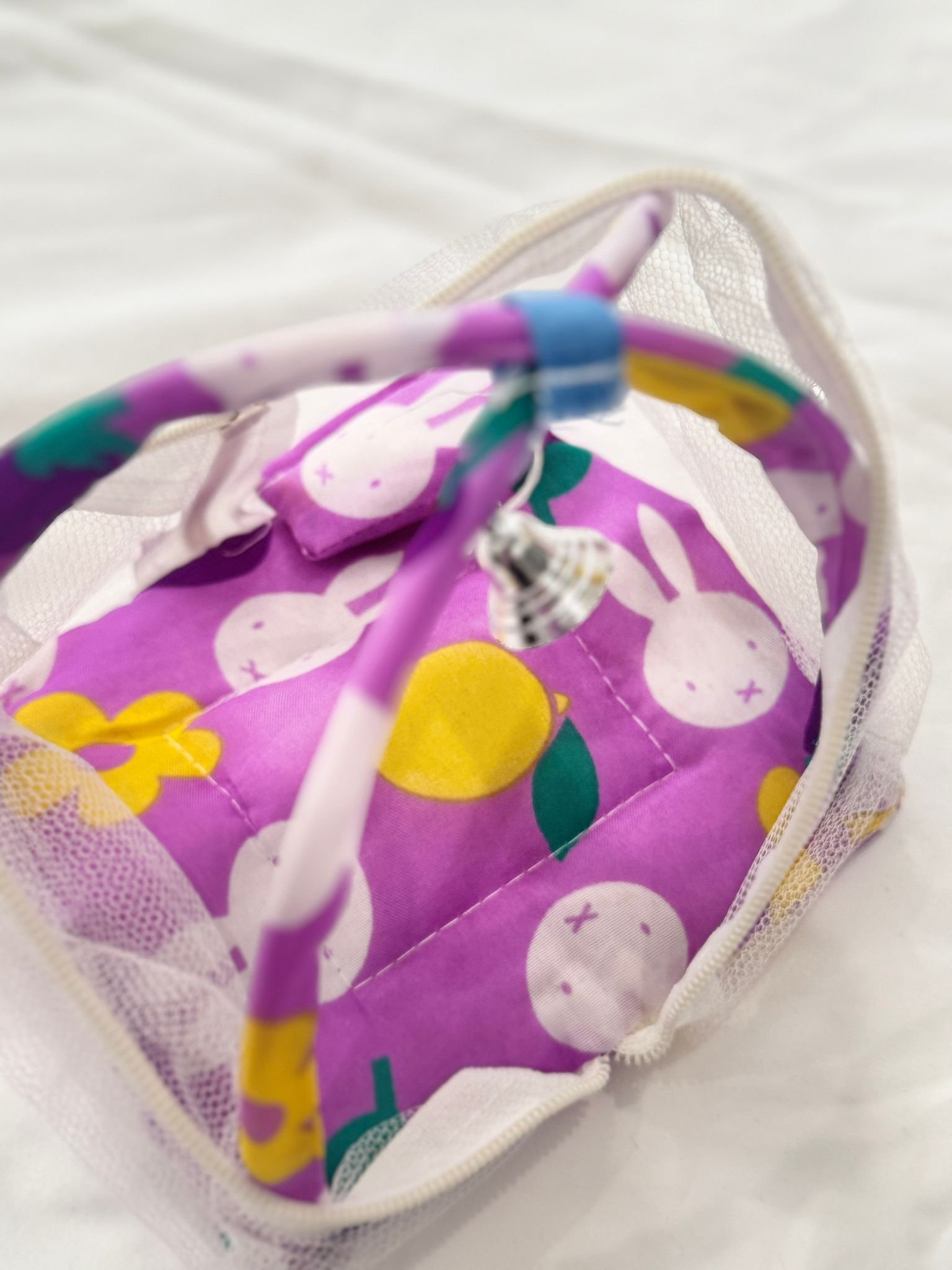 This adorable mosquito net bed for Laddu Gopal features a vibrant purple cushion with cute bunny and fruit prints. Designed to keep your deity safe from insects while adding a touch of charm to the mandir, the set includes a soft padded base, built-in pillow, and a delicate white mesh canopy supported by a colorful printed frame. Ideal for Laddu Gopal idols in sizes 0 to 3.