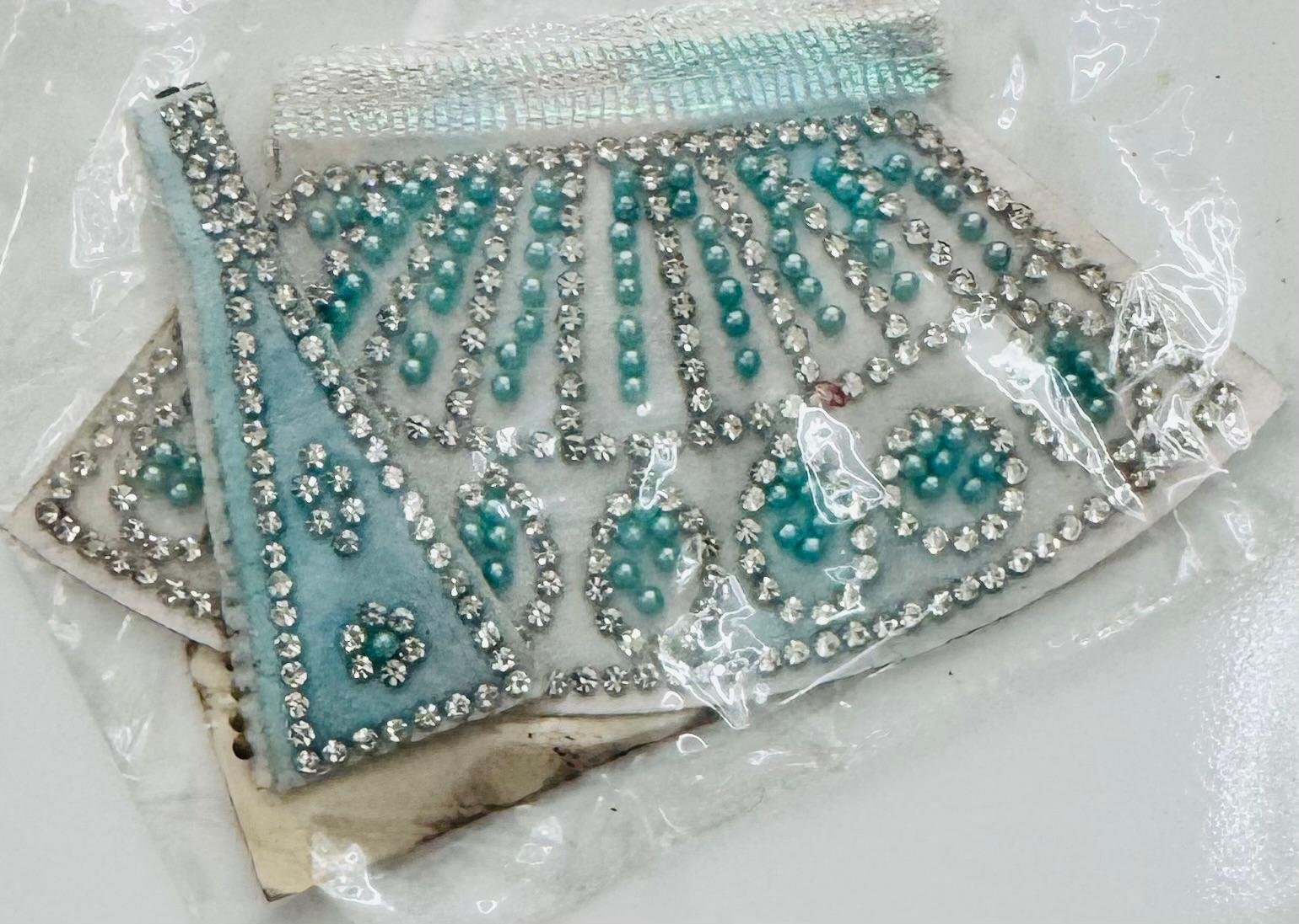 Elegant Radha Rani dress crafted in soft ice blue velvet, adorned with shimmering white and aqua crystal beads in symmetrical patterns. The silver lace adds a regal finish, making this a perfect pick for festive occasions or everyday worship of your beloved deity.