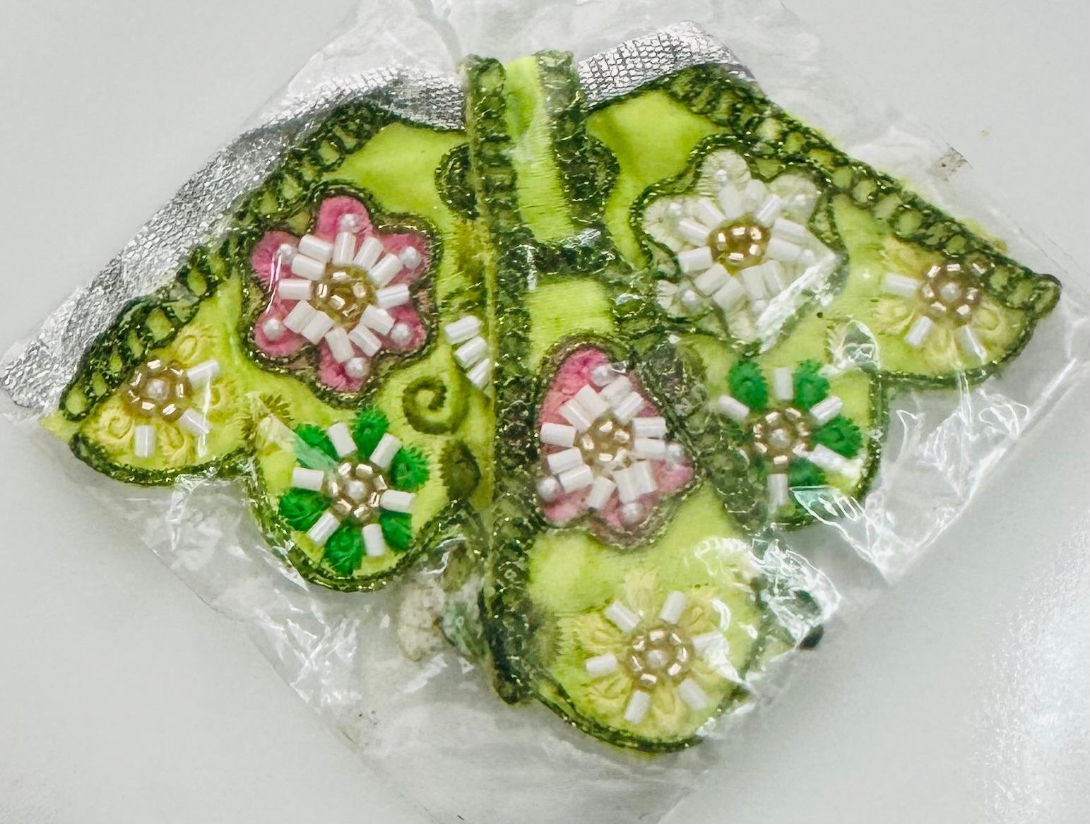 Delicate and cheerful Radha Rani dress in lime green, adorned with intricate floral beadwork in white, pink, and green tones. Finished with silver lace and soft embroidery, it brings a fresh, springtime charm to your deity’s attire.