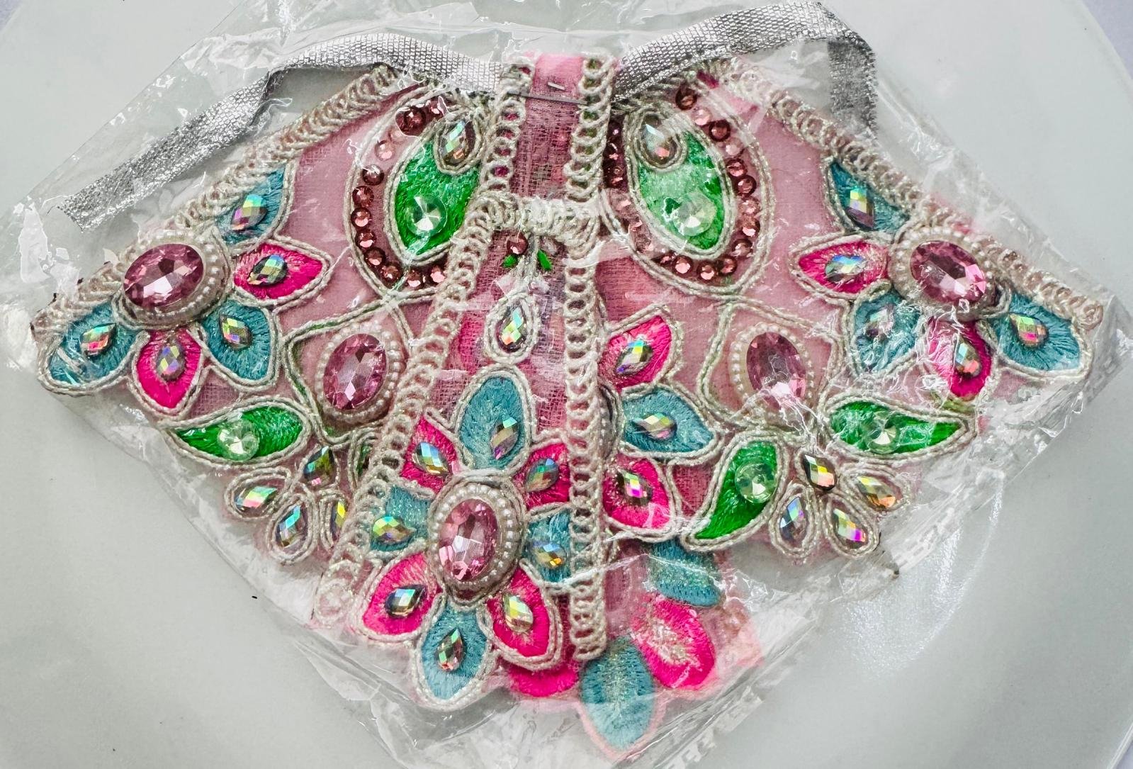 Elevate the divine beauty of your Radha Rani idol with this exquisite designer dress, featuring intricate hand embroidery with colorful threadwork, shimmering sequins, and sparkling mirror stones. Crafted with delicate fabric in soft pink tones, this dress is adorned with floral and peacock-inspired motifs in vibrant shades of green, blue, and fuchsia. A perfect attire for festive occasions and daily worship.