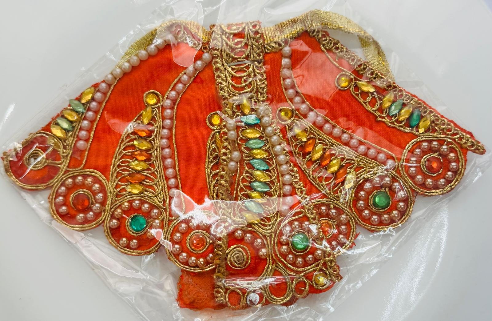 Enhance your Radha Rani idol’s beauty with this orange embroidered lehenga with pearl and stone accents. The luxurious fabric is highlighted with golden pearls, shimmering accents, and green stone embellishments, creating a royal look ideal for festive and daily use.