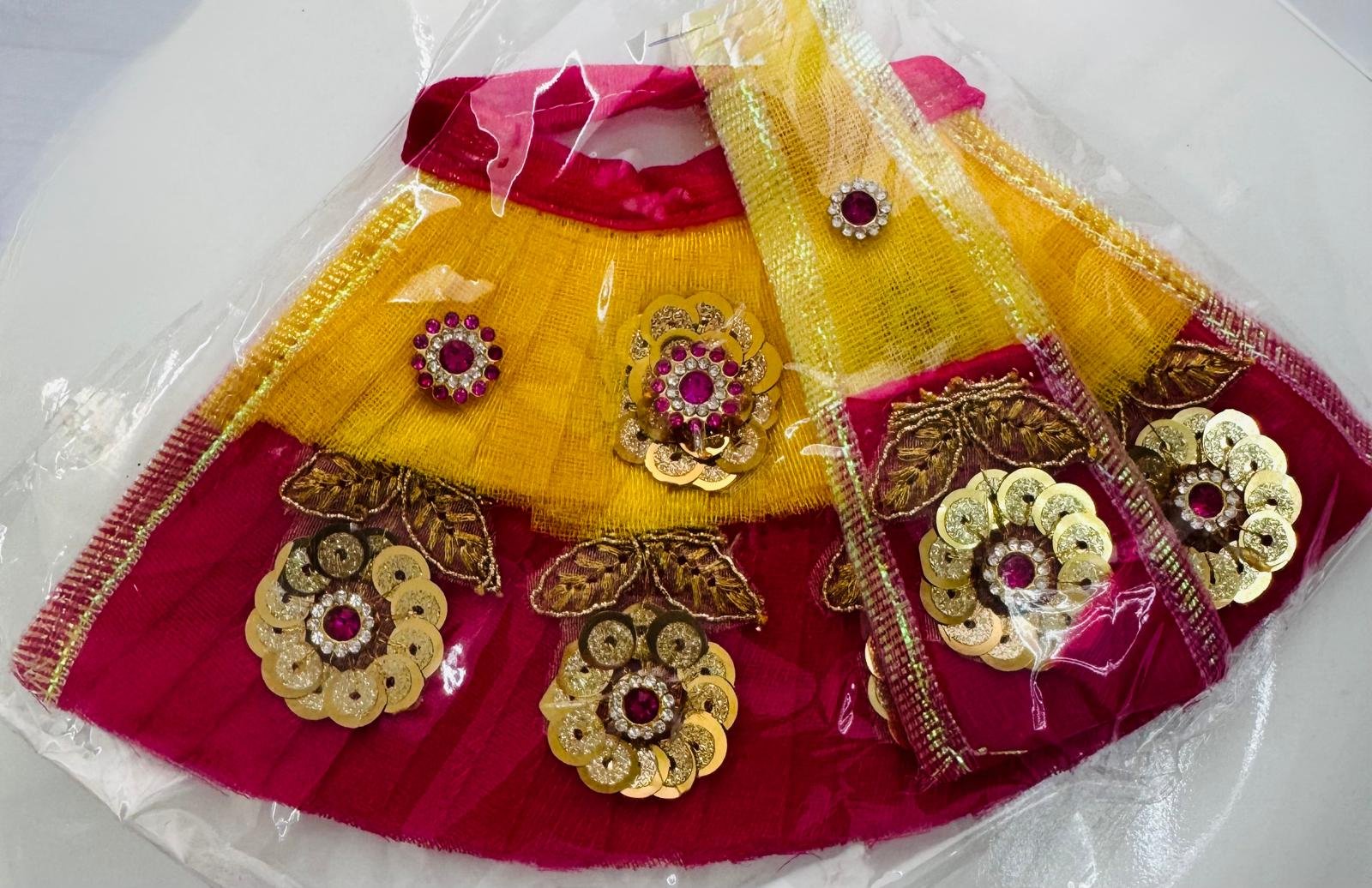 Celebrate divine elegance with this vibrant yellow and pink Radha Rani dress, embellished with golden floral sequins, leaf embroidery, and gem-centered designs. A perfect attire for festive rituals and traditional temple décor, bringing charm and grace to your deity’s ensemble.