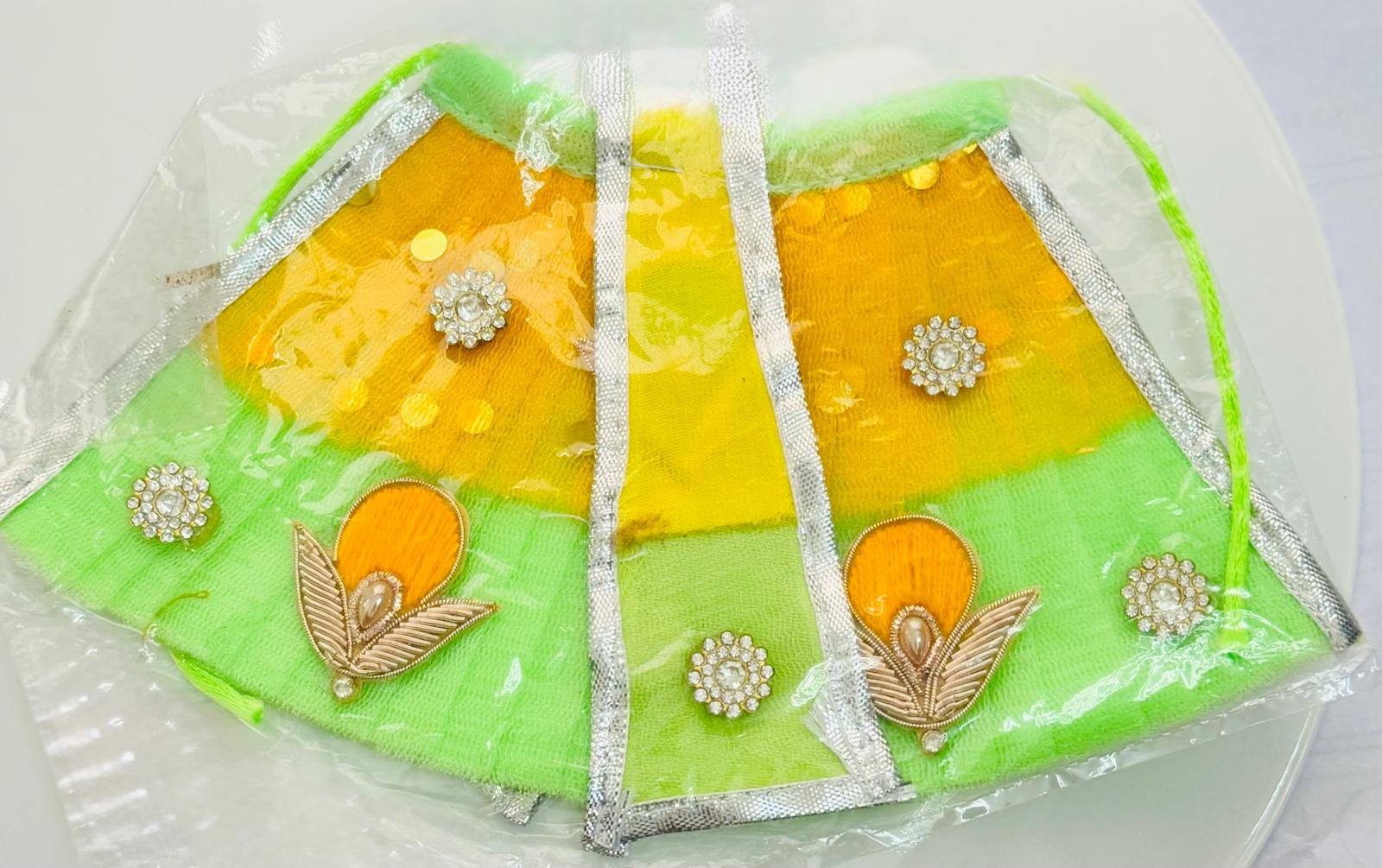This radiant lehenga sparkles with thread and stone work, celebrating Radha Rani’s elegance in every shimmering fold.