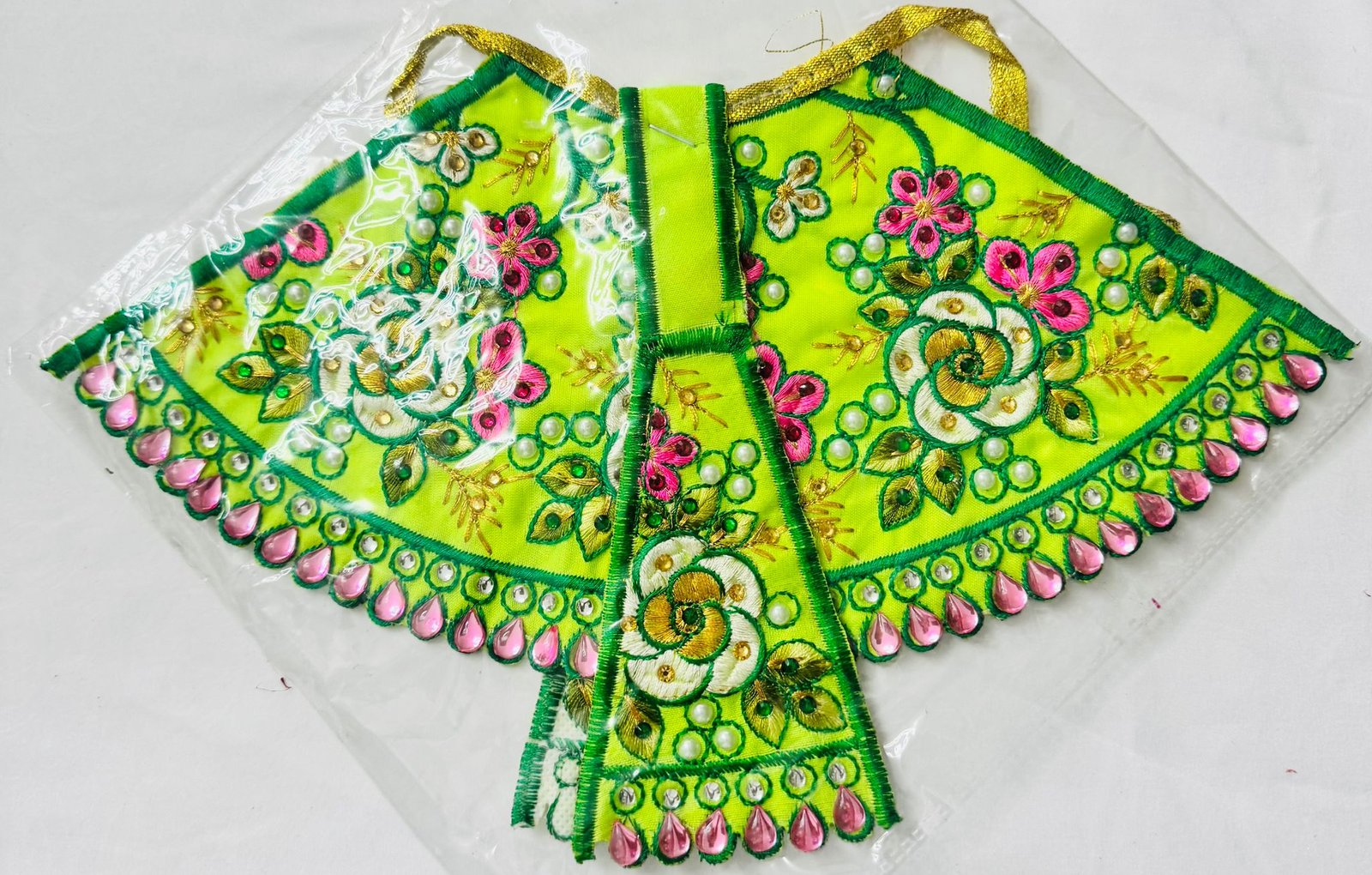 Vibrant light green Radha Rani dress adorned with delicate floral embroidery in pink, white, and green threads. Finished with elegant pink drop beads along the border and subtle pearl detailing—perfect for festive or devotional wear.
